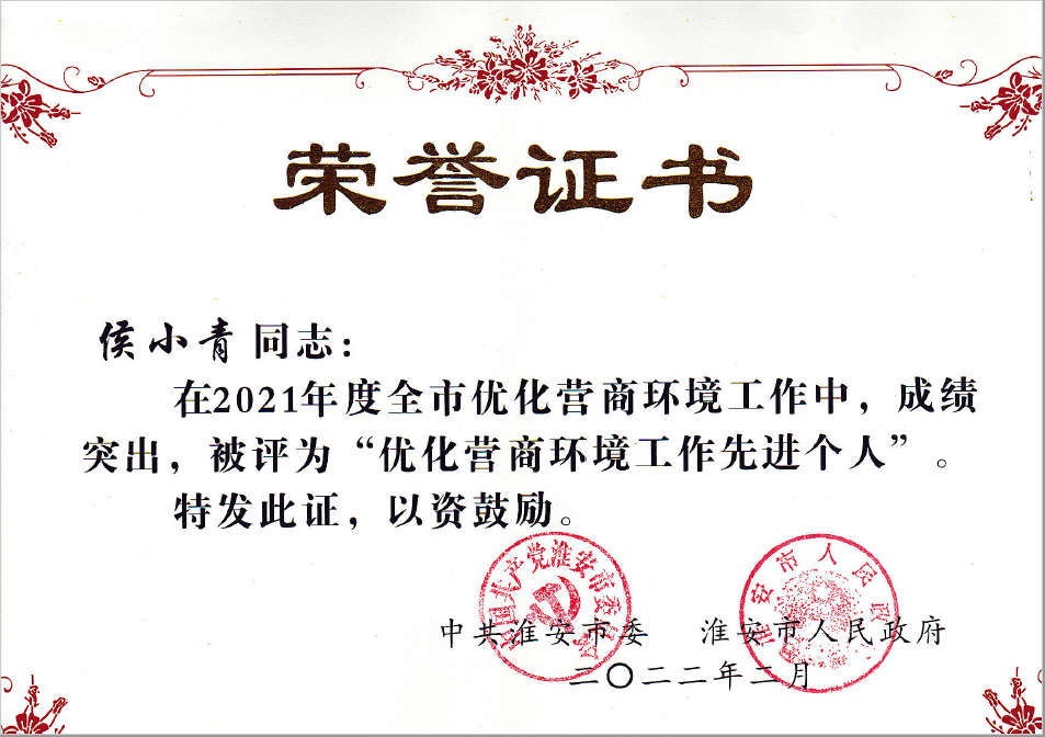 2月10日,淮安市重特大項目攻堅暨優化營商環境大會召開,淮安分公司被市委市政府授予“2021年度優化營商環境先進集體”、第三次被授予“優化營商環境流動紅旗”、是全市為數不多獲此殊榮的金融機構。分公司侯小青同志獲得“2021年度優化營商環境工作先進個人”榮譽稱號。